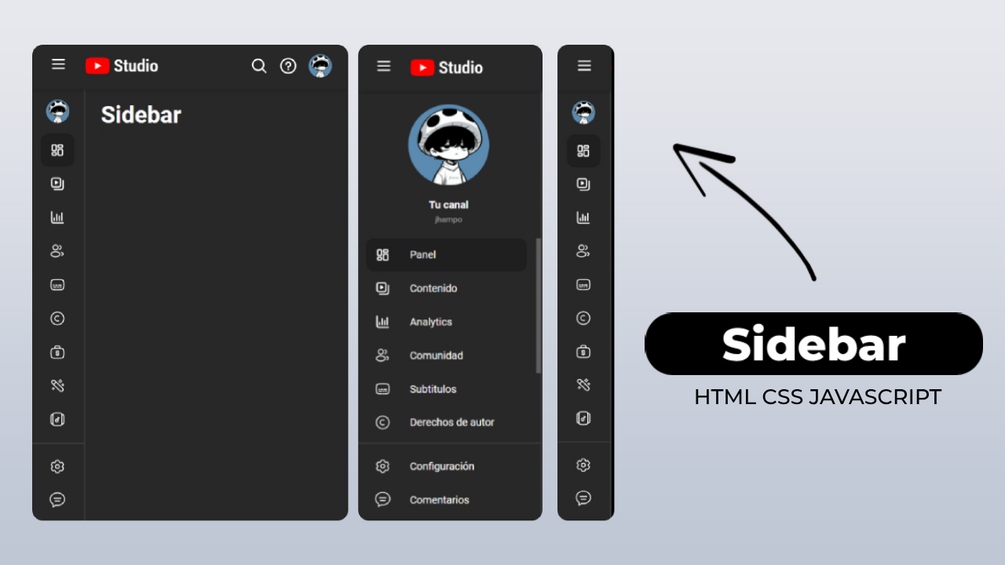 Obtén el diseño completo de una Barra Lateral y una Barra de Navegación, desarrolladas con HTML, CSS y JavaScript.